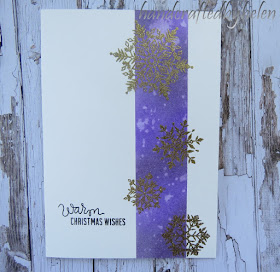 Once I had done the ink blending, I did the sentiments with black ink and clear embossing powder.  Finally I stamped the snowflake stamps onto and overhanging the inked panels with clear versamark ink and gold glitter embossing powder, using the misti, so that I could stamp them all at once.  On reflection, I think maybe the snowflakes would have stood out more if I had used just ordinary gold embossing powder, so there was more of a contrast. Not sure.