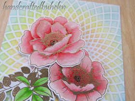 Putting the card together, I stuck the top of the stencil to my card base, flipped it over and trimmed it to the card base, then stuck the rest of the front panel down. I mounted the flowers and leaves with foam tape, and also my sentiment strip. The sentiment die cut I mounted 3 of them on top of each other to give it a bit more dimension, then stuck that onto the card above the sentiment strip with glue. I coloured the two hearts with some sparkle gelly roll pen. That completes the card.